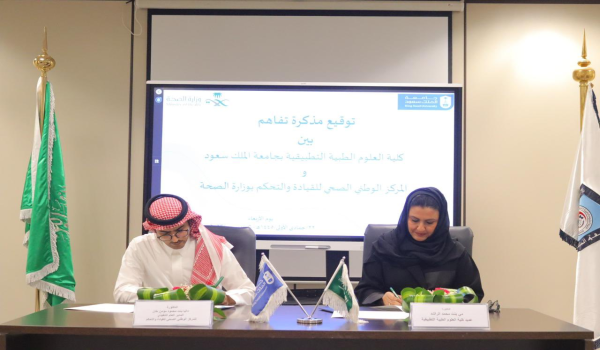 نيابة عن معالي رئيس الجامعة الدكتور بدران بن عبدالرحمن العمر، عميد كلية العلوم الطبية التطبيقية الدكتورة مي الراشد توقع مذكرة تفاهم مع وزارة الصحة ممثلة بالمركز الوطني الصحي للقيادة والتحكم، حيث تهدف المذكرة إلى تأطير العمل المشترك بين الجانبين والتعاون في المجالات البحثية والتدريبية والتقنية والتطويرية والاستشارات والدراسات الفنية، وتفعيل تبادل الخبرات بين الجانبين.