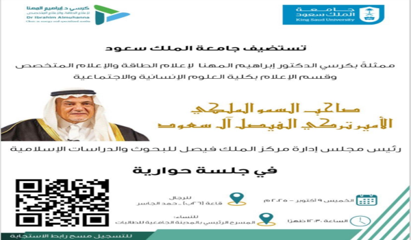 يستضيف كرسي الدكتور إبراهيم المهنا لإعلام الطاقة والإعلام المتخصص بالتعاون مع قسم الإعلام بجامعة الملك سعود في جلسة حوارية صاحب السمو الملكي الأمير تركي الفيصل آل سعود رئيس مجلس إدارة مركز الملك فيصل للبحوث والدراسات الإسلامية.