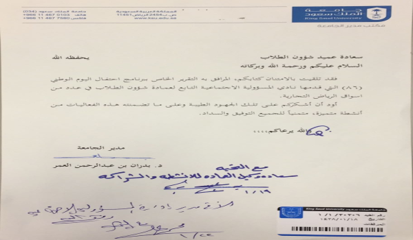 بعث معالي مدير الجامعة الدكتور بدران العمر خطاب شكر إلى نادي المسؤولية الاجتماعية، نظير قيام النادي بتنظيم برناج خاص عن اليوم الوطني الـ86 في عدد من الأسواق التجارية بمنطقة الرياض، والذي نال استحسان الجميع.