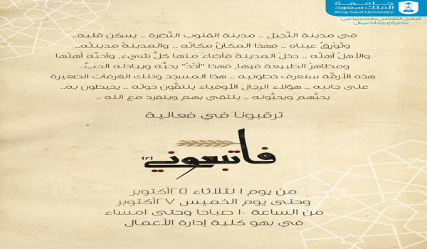 نظم النادي الثقافي الاجتماعي بكلية إدارة الأعمال التابع لوكالة عمادة شؤون الطلاب لشؤون الطالبات يوم الثلاثاء ٢٤ محرم 1438هـ فعالية «فَاتَّبِعُونِي يُحْبِبْكُمُ اللَّه» التي استمرت لثلاثة أيام.