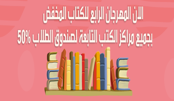 تطلق إدارة صندوق الطلاب اليوم وحتى نهاية الفصل الحالي مهرجان الكتاب المخفض بخصومات تصل إلى50% في جميع مراكز بيع الكتب التابعة للصندوق، وذلك لطلاب وطالبات ومنسوبي الجامعة من أعضاء هيئة التدريس والموظفين، وذلك في مركز بيع الكتب الواقع بمبنى 17 الدور الأرضي لطلاب ومنسوبي الجامعة، وتم تخصيص مكتب 15 مبنى 25 في المدينة الجامعية للطالبات والمنسوبات إلى جانب أقسام الطالبات بمركز كلية الطب بمستشفى الملك خالد الجامعي.