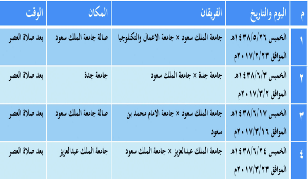 وقد قسمت الجامعات المشاركة إلى مجموعتين، جاء منتخبنا في المجموعة الثانية والتي تضم كلا من: جامعة الأعمال والتكنلوجيا، جامعة جدة، جامعة الإمام محمد بن سعود الإسلامية ، جامعة الملك عبدالعزيز.