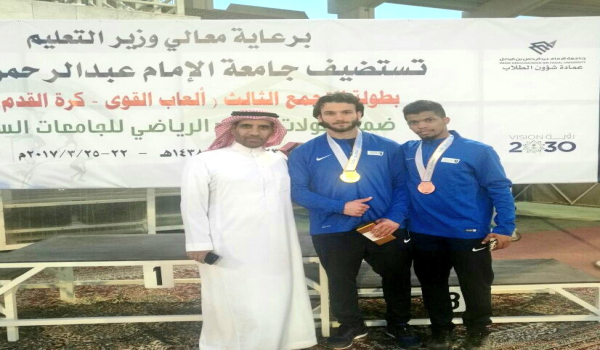 توج الأمين العام للاتحاد الرياضي للجامعات السعودية الدكتور عبدالله البقمي وبحضور سعادة عميد شؤون الطلاب ا.د فهد القريني وسعادة وكيل العمادة للشؤون الرياضية د.عبدالله السليمي منتخب الجامعة لألعاب القوى بالمركز الثالث والميداليات البرونزية بعد ان استطاع لاعبوا منتخبنا من تحقيق 12 ميدالية مختلفة ( 1 ذهب ، 3فضة ، 8 برونز ) وبمجموع نقاط بلغ ( 122 نقطة )، وقد حقق المركز الأول جامعة ام القرى (7 ذهب ، 6 فضة ، 4 برونز ، 192نقطة) ، والمركز الثاني جامعة جازان (4 ذهب ، 5 فضة ، 3 برونز ، 157 نقطة).