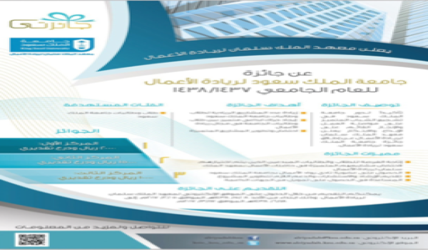 تأكيداً لدور جامعة الملك سعود في تشجيع الشباب المتميز على مواصلة العمل والإنجاز القائم على الإبداع والابتكار، فقد أطلق معهد الملك سلمان لريادة الأعمال جائزة جامعة الملك سعود لريادة الأعمال، ويتم استخدام البوابة الإلكترونية للمعهد في التقديم والاشتراك في الجائزة.