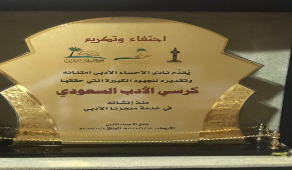 كرم نادي الأحساء الأدبي مؤخراً كرسي الأدب السعودي على جهوده العلمية في خدمة الأدب السعودي، وقد عقدت بهذه المناسبة ندوة حول أعمال الكرسي وإنجازاته، شارك فيها المشرف على الكرسي الدكتور صالح معيض الغامدي والدكتورة هند المطيري والدكتور عبدالله المعيقل.