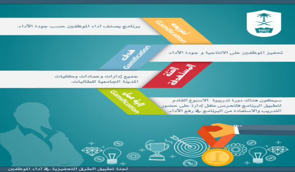 ولفتت الدكتورة الحربي إلى أن هذه الآليات تستخدم مبدأ الألعاب والمسابقات وتُكرم المتميزين بتوزيع الميداليات والمكافآت لهم وتعاملهم مثل المتسابقين في مسابقة أو لعبة إلكترونية فبناءً على أداء الموظف يستطيع الحصول على نقاط وميداليات ويزيد من رصيده وهذا يؤهله للحصول على المميزات الإدارية والمكافآت.