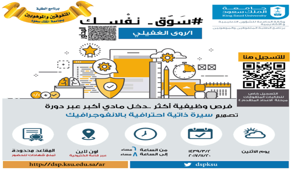 انطلاقاً من حرص برنامج الطلبة المتفوقين والموهوبين على تعزيز قدرات الطالبات المتفوقات والموهوبات بالجامعة في مجال الاستعداد الوظيفي والتوجه لسوق العمل، نظم البرنامج دورة تدريبية عن بعد On-line بعنوان «سوّق نفسك»، استهدفت الطالبات المتفوقات والموهوبات في البرنامج، عقدت الدورة مؤخرًا وقدمتها المدربة الأستاذة روى الغفيلي.