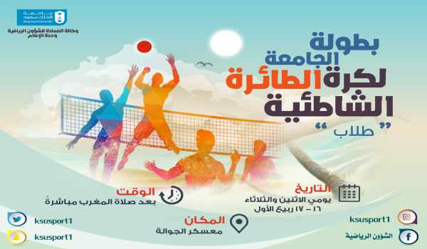تقيم وكالة عمادة شؤون الطلاب للشؤون الرياضية ممثلة في إدارة البرامج والأندية الرياضية بطولة الجامعة لكرة الطائرة الشاطئية، وذلك يوم غد الاثنين والثلاثاء في معسكر الجوالة داخل الحرم الجامعي، علماً بأن التسجيل سيكون مفتوحاً من بعد صلاة المغرب مباشرة، حيث يمكن لأي طالب مع زميله تشكيل فريق للمشاركة في البطولة ولا يشترط أن يكون الفريق من نفس الكلية.