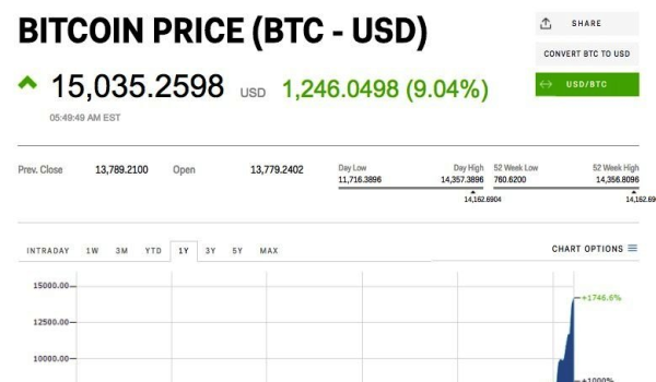 تواصل العملة الرقمية المشفرة بيتكوين ارتفاعها الجنوني حيث وصلت قيمتها مؤخراً إلى 15 ألف دولار أمريكي للمرة الأولى في تاريخها المستمر منذ تسع سنوات، ويأتي هذا الارتفاع غير المسبوق بعد مرور حوالي 12 ساعة على وصول قيمتها إلى 14 ألف دولار.
