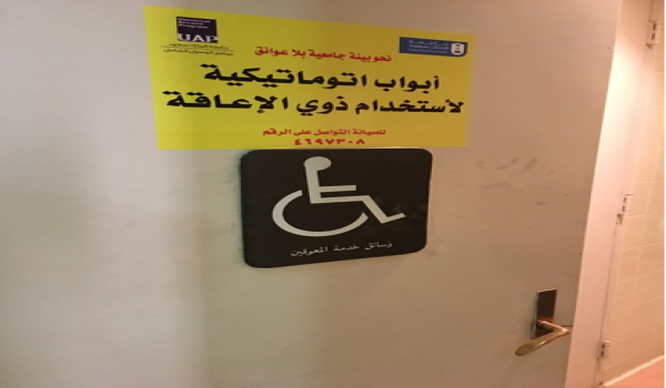 واستطرد قائلاً: لا أحد ينكر أن جميع خدمات برنامج الوصول الشامل متوفرة في المرافق الرئيسية في الجامعة وعدد كبير من الكليات والعمادات، وأكبر دليل على ذلك توفرها مكتملة في بهو الجامعة، وكذلك في كلية التربية، لكن في المقابل توجد كليات معينة لا يوجد فيها برنامج الوصول الشامل، وأنا شخصياً لاحظت غياباً تاماً لبرنامج الوصول الشامل في كلية الحقوق والعلوم السياسية, سواء على مستوى الأبواب الأوتوماتيكية أو المصاعد أو المسارات!