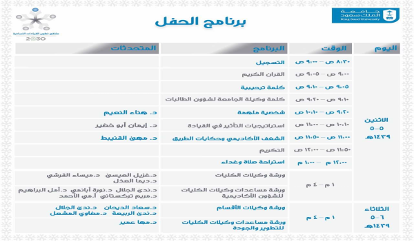 تعتزم المدينة الجامعية للطالبات إقامة ملتقى تطوير القيادات النسائية في دورته الثانية والمزمع انعقاده يومي الاثنين والثلاثاء 5-6/5/1439هـ الموافق 22-23/1/2018م والذي يهدف إلى إثراء المعرفة وتبادل الخبرات بين القيادات ذوات الخبرة والقيادات الجديدة وتعزيز التواصل الداخلي بينهما، ويستهدف وكيلات الكليات والأقسام والعمادات المساندة ومساعدات الوكيلات ومديرات الإدارات.