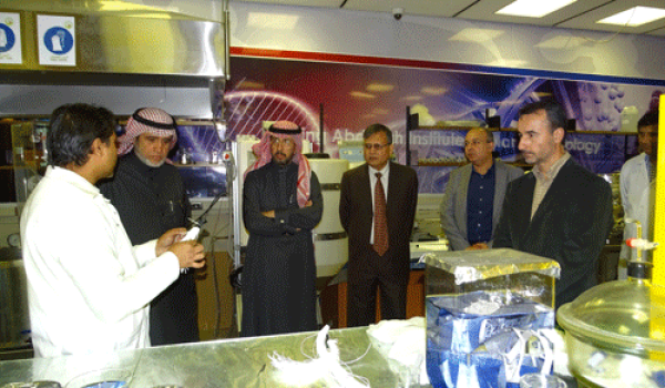 وكان في استقبال والترحيب بالفريق الدكتور عبدالعزيز الهزاع وكيل المعهد للشؤون الفنية والدكتور أحمد التوني الأستاذ المشارك بالمعهد، حيث قام الفريق بالاطلاع على مختبرات المعهد بدءًا بمختبر الأغشية الذي يهتم بتطبيق تقنية النانو في تحلية المياه، واطلع الفريق على أغشية البوليمرات وأنابيب النانو الكربونية التي أنتجها المعهد واستمع لشرح د. جافيد علم الأستاذ المشارك بالمعهد عن كيفية تحضير واختبار جودة هذه المواد، ثم توجه الفريق إلى مختبر المجاهر الإلكترونية، حيث اطلعوا على كيفية عمل المجهر الإلكتروني الماسح والنفاذ، وشاهدوا تجربة عملية لاستجابة جسيمات أكسيد الحديد النانوية المنتجة في المعهد للمجال المغناطيسي وتعرّف على تطبيقاتها الطبية المتوقعة. كما استمعوا لشرح الدكتور أحمد التوني عن الغرفة النقية ومختبر الكيمياء بالمعهد وتجهيزاتهما الحديثة، وأبدى الفريق الزائر إعجابه بالتقنيات الحديثة المتوفرة في المعهد حيث تمت مناقشة إمكانية التعاون في بعض المجالات البحثية المشتركة.