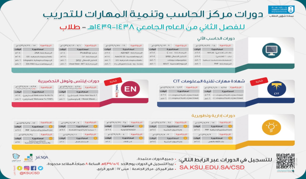 أعلن مركز الحاسب وتنمية المهارات للتدريب بعمادة شؤون الطلاب مع بداية الفصل الثاني للعام الجامعي 1438 -1439هـ طرح العديد من الدورات، حيث سيطرح دورات في الحاسب الآلي، مثل دورة شهادة مهارات تقنية المعلومات CIT والمعتمدة من هيئة المؤهلات الأسكتلندية ومن المؤسسة العامة للتدريب التقني والمهني، بالإضافة إلى العديد من الدورات التخصصية في الحاسب الآلي، مثل دورة التحليل الإحصائي SPSS والبرمجة بلغةC# ولغة C++ ولغة جافا ولغة PHP والرسوم الهندسية أوتوكاد والرسوم الهندسية ريفيت والرسوم الهندسية 3Ds MAX ومات لاب ونظم المعلومات الجغرافية GIS والتخطيط والتحكم بالمشروع بريمافيرا ودورة الرسوم المعلوماتية إنفوجرافيك وغيرها من دورات الحاسب، ودورات مميزة في اللغة الإنجليزية تطرح لأول مرة «دورات إيلتس وتوفل التحضيرية» بكافة المستويات «المحترفين والمتوسطين والمبتدئين»، كما يقدم المركز دورات في المجال الإداري وتطوير الذات، مثل دورة إدارة المشاريع PMP ودورة إدارة الموارد البشرية ودورة الثقافة القانونية، وكذلك إدارة الجودة الشاملة 6 سيجما، بالإضافة إلى دورات أخرى تطويرية تهم الطالب الجامعي، جميع هذه الدورات بشهادات معتمدة من المؤسسة العامة للتدريب التقني والمهني ومن السجل المهاري، ولمزيد من التفاصيل عن الدورات ومواعيدها والاستفسارات تفضل بزيارة موقع الحساب الموحد على الشبكات الاجتماعية @KSUCSD