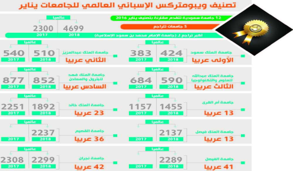 كشف آخر تصنيف عالمي للجامعات «يناير 2018» استرداد 12 جامعة سعودية عافيتها وتقدمها عدة مراكز عن تصنيف العام الماضي «يناير 2017»، ووفق ما أعلنه موقع «ويبومتريكس» الإسباني الشهير فقد حافظت جامعة الملك سعود على صدارة الجامعات السعودية والعربية رغم انخفاض مستواها عالمياً باحتلالها المركز 424 بعدما كانت في المركز 383 العام الماضي.