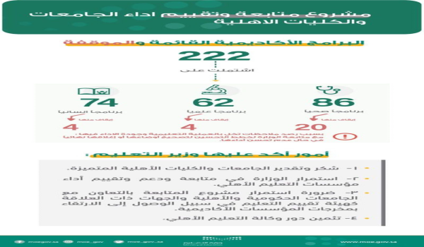 وكان وزير التعليم، الدكتور أحمد العيسى، قد اطلع على التقرير الختامي لمشروع متابعة وتقييم أداء الجامعات والكليات الأهلية، التي بلغ عدد برامجها الأكاديمية 222 برنامجًا موزعة على مناطق السعودية كافة، وتمت زيارتها وتقييم أدائها، وشملت تلك البرامج 86 برنامجًا صحيًّا، و62 برنامجًا علميًّا، و74 برنامجًا إنسانيًّا.