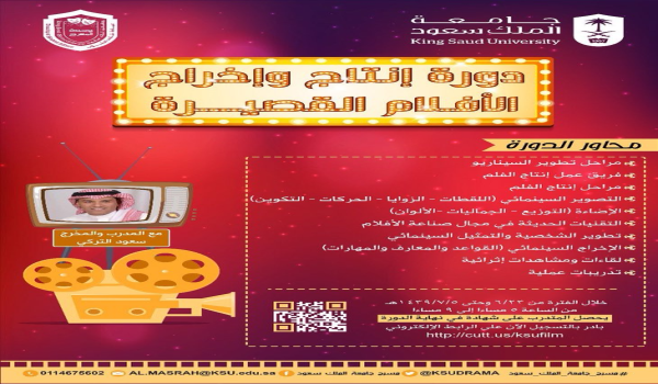 يشار إلى أن الدورة تمتد لعشرة أيام خلال الفترة من 6/32 وحتى 9321/7/5هـ في الفترة المسائية، بينما ينتهي التسجيل في مسابقة الأفلام يوم 33 رجب القادم، ولمزيد من المعلومات أو التسجيل يرجى زيارة حساب إدارة المسرح على تويتر KSUDRAMA@ أو زيارة مقر إدارة المسرح بالدور الرابع بعمادة شؤون الطلاب مبنى 17.