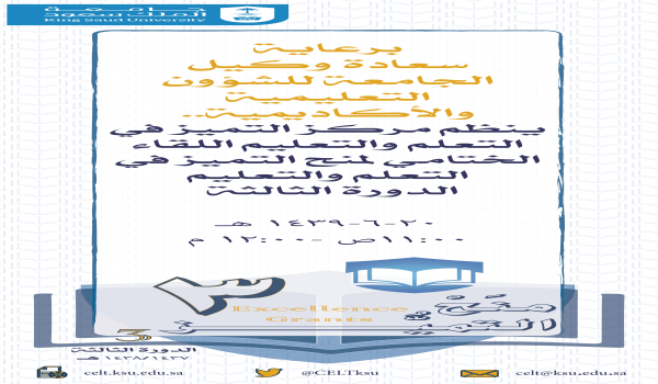 ينظم مركز التميز في التعلم والتعليم بوكالة الجامعة للشؤون التعليمية والأكاديمية بجامعة الملك سعود اللقاء الختامي لمشروع "منح التميز في التعلم والتعليم" – الدورة الثالثة - وذلك برعاية وكيل الجامعة للشؤون التعليمية والأكاديمية، وسيتم خلال اللقاء تسليم شهادات الشكر وإنجاز المنحة.