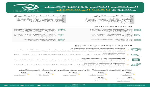 وشهد افتتاح الملتقى، التعريف بالمشروع من خلال عرض مرئي يختصر الفكرة وما تم إنجازه وما سيتم العمل عليه، وفق توجه الوزارة نحو تحقيق رؤية 2030, وعرض بعض التجارب الطلابية من تعليم جازان والمجمعة، ثم تكريم الجامعات وإدارات التعليم المنفذة للمشروع.