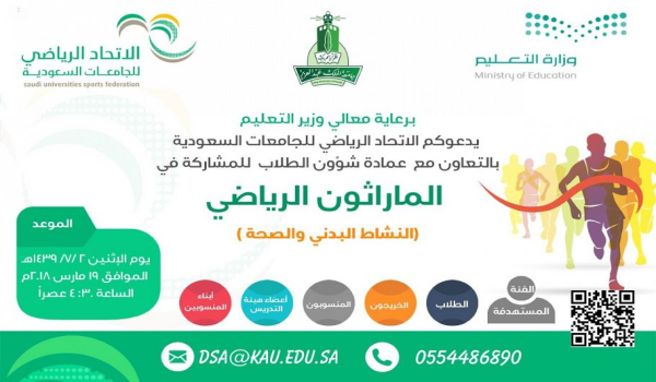 يرعى معالي وزير التعليم الدكتور أحمد العيسى، الماراثون الرياضي تحت شعار «النشاط البدني والصحة» الذي ينظمه الاتحاد الرياضي للجامعات السعودية بالتعاون مع عمادة شؤون الطلاب بجامعة الملك عبدالعزيز بجدة، يوم غد الاثنين 2 رجب 1439هـ الموافق 19 مارس 2018م, وبطول 5 كيلومتر ، وذلك بالحرم الجامعي بجامعة الملك عبدالعزيز.