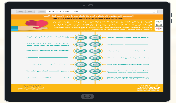 كل هذه المنظومة الإلكترونية في تقديم الخدمات، والاستفادة منها تحت إشراف وإدارة حكومية من قبل هيئة رعاية الأشخاص ذوي الإعاقة والتي صدرت الموافقة على تنظيمها من قِبَل مجلس الوزراء بتاريخ الموافق 13/ 2/ 2018م، ولا شك أن مثل هذا التنظيم يتيح لجميع مقدمي الخدمة بيانات دقيقة، تسهل تقديم الخدمات عبر الدخول المقيد لهم، ويوفر للجهات العليا مراقبة أداء الوزارات تباعاً، شاملاً عدد الخدمات ونوعيتها ومصدر مقدم الخدمة ومدى رضا الطرفين حول تقديم وتلقي الخدمات.