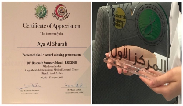 وحصلت الطالبة المخترعة سارة خضر عبدالحميد من كلية الصيدلة على الميدالية البرونزية من معرض كيوي الدولي 18 وجائزة خاصة من اتحاد المخترعين التايواني، في حين حصلت الطالبة المتفوقة آية الشرقي على المركز الأول في البحث الذي شاركت به في فعاليات «المدرسة الصيفية للأبحاث» والتي ينظمها مركز الملك عبدالله العالمي للأبحاث الطبية «كيمارك» للعام العاشر على التوالي، حيث شارك في هذه المسابقة 88 طالباً وطالبة من مختلف جامعات المملكة.
