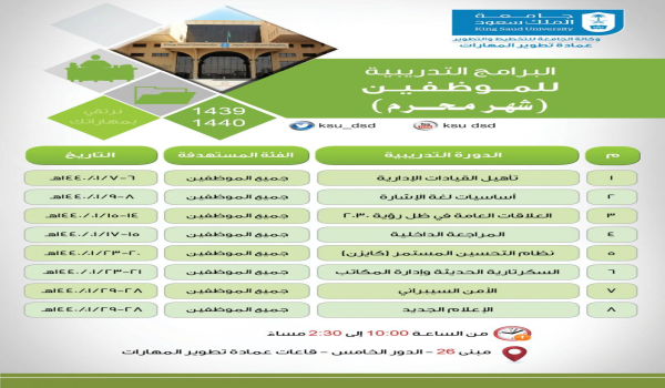 انطلاقاً من اهتمام عمادة تطوير المهارات بمبدأ التنمية المهنية والذاتية المستدامة التي تلبي الاحتياجات التدريبية لمنسوبي الجامعة، تنظم عمادة تطوير المهارات حزمة من البرامج التدريبية لشهر محرم 1440هـ، والتي تستهدف الموظفين من منسوبي الجامعة وتشمل: «تأهيل القيادات الإدارية، أساسيات لغة الإشارة، العلاقات العامة في ظل رؤية 2030، المراجعة الداخلية، نظام التحسين المستمر «كايزن»، السكرتارية الحديثة وإدارة المكاتب، الأمن السيبراني، والإعلام الجديد».