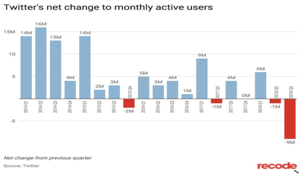لم تخالف تويتر التوقعات مؤخرًا بتراجع مستخدميها، فبعد سياستها الجديدة ضد الحسابات الوهمية والحسابات السياسية، تراجع عدد مستخدمي الشبكة بنحو 9 ملايين مستخدم خلال الربع الأخير، حيث هبطت من 335 مليون مستخدم إلى 326 مليوناً.
