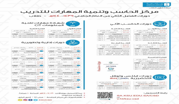 ويبدأ التسجيل في الدورات بتاريخ 30/4/1440هـ الساعة 10 صباحاً عبر موقع المركز على الرابط SA.KSU.EDU.SA/CSD أو v.ht/ksu-csd ولمزيد من المعلومات والاستفسارات عبر حسابات المركز في التواصل الاجتماعي @KSUCSD، صرح بذلك مدير مركز الحاسب وتنمية المهارات للتدريب الأستاذ عبدالملك الموسى.