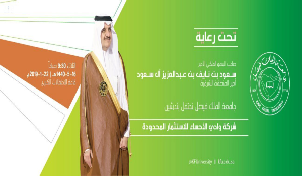 رعى صاحب السمو الملكي الأمير سعود بن نايف بن عبدالعزيز آل سعود أمير المنطقة الشرقية، حفل تدشين شركة وادي الأحساء للاستثمار، وذلك في قاعة الاحتفالات الكبرى بجامعة الملك فيصل بالأحساء.