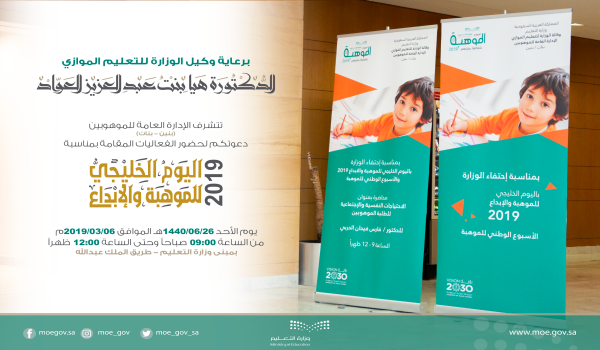 وتقيم الوزارة بهذه المناسبة احتفالية تحت رعاية وكيل التعليم الموازي الدكتورة هيا بنت عبدالعزيز العواد تشمل محاضرات وورش عمل ومعرض مصاحب للفعالية، وتأتي العناية بالموهوبين في الدول الأعضاء بمكتب التربية العربي لدول الخليج، في إطار الاهتمام بالقدرات الكامنة لدى هذه الفئة المتميزة من الأبناء، ودعماً للبرامج المقدمة لهم؛ بغرض اكتشاف قدراتهم ومجالات إبداعهم، والعمل على توجيهها التوجيه السليم، وتشجيعهم على المزيد من الإبداع والابتكار، وتوظيف ذلك في إعداد برامج إرشادية فاعلة من شأنها تعويدهم السلوك الإيجابي الذي يبرز ما لديهم من مواهب، بالإضافة إلى تهيئة المناخ التربوي المناسب لاستنبات بذور الموهبة والإبداع وتوفير الرعاية المجتمعية لها في ظل إدراك المحيطين لإمكانات الموهوب وخصائصه، وتقديم خدمات تخصصية لتعليم الموهوب وتعويده على كيفية تنمية قدراته الخاصة وممارستها، بما يخدم نفسه ووطنه؛ الأمر الذي ينعكس على قدرته في مشاركة مجتمعة آماله وطموحاته في التنمية والتطوير.