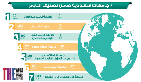 حققت سبع جامعات سعودية ترتيباً متقدماً في تصنيف التايمز البريطاني، حيث جاءت جامعة الملك عبدالعزيز في المركز الأول عربياً وضمن الترتيب ٢٠١ عالمياً، وجامعة الفيصل الثانية عربياً وضمن ٢٥١ عالمياً، كما احتلت جامعة الملك فهد للبترول والمعادن الترتيب التاسع عربياً وضمن ٥٠٢ عالمياً، وجامعة الملك سعود في الترتيب العاشر عربياً وضمن ٥٠١ عالمياً، فيما حققت جامعة الملك سعود بن عبدالعزيز للعلوم الصحية المرتبة الحادية عشر عربياً وضمن ٥٠١ عالمياً، وجامعة الملك خالد في الترتيب السابع عشر عربياً وضمن ٦٠١ عالمياً، كما احتلت جامعة الإمام عبدالرحمن بن فيصل في التصنيف ضمن ١٠٠١ عالمياً.