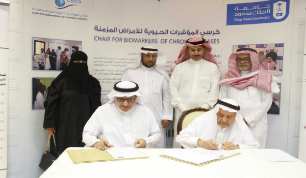 وقع وكيل الجامعة للدراسات العليا والبحث العلمي الدكتور خالد الحميزي ورئيس جمعية السكري السعودية الخيرية الأستاذ عبدالعزيز الحميدي، مذكرة تفاهم بين كرسي أبحاث المؤشرات الحيوية للأمراض المزمنة بجامعة الملك سعود وجمعية السكري السعودية الخيرية، وذلك يوم الخميس 4 صفر 1441هـ الموافق 3 أكتوبر 2019م في قاعة التشريفات، بحضور عميد البحث العلمي الدكتور محمد الوابل وعميد كلية العلوم والمشرف على كرسي المؤشرات الحيوية للأمراض المزمنة الدكتور ناصر الداغري ووكيل عمادة البحث العلمي للكراسي البحثية الدكتور عبدالحميد العليوي ووكيل عمادة البحث العلمي للأقسام النسائية الدكتورة عبير المصري.