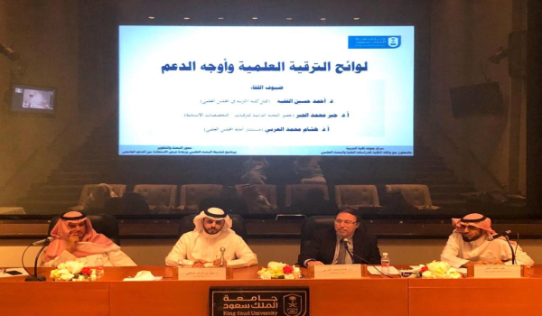 عقد مركز البحوث بكلية التربية بالتعاون مع وكالة الكلية للدراسات العليا والبحث العلمي، مؤخراً، لقاء بعنوان «لوائح الترقية العلمية وأوجه الدعم» تم خلاله التعريف بضوابط الترقية ومناقشتها وكيفية الاستفادة من برامج الدعم المقدمة من عمادة البحث العلمي.
