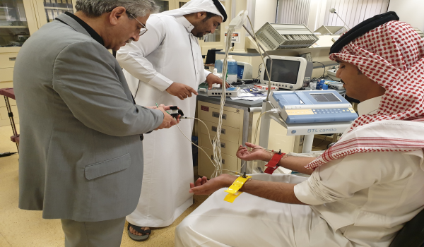 بعد ذلك قدّم المهندس فهد العتيبي، أخصائي مختبر التكنولوجيا الحيوية، فكرة موجزة عن التجهيزات الموجودة في معمل المعدات الحيوية الطبية، وتحدث بالتفصيل عن جهاز تخطيط القلب «EEG» موضحاً أن هذه التقنية تستخدم لتسجيل الموجات الكهربائية التي تصدر عن عضلة القلب من خلال الحزم العصبية الموجودة، وتم بعد ذلك إجراء تخطيط قلب لأحد الطلاب والاطلاع على المخط القلبي الطبيعي وبعض المخططات لحالات مرضية مختلفة.