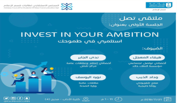 نظم المجلس الاستشاري لطالبات قسم الإعلام أولى جلساته من «ملتقى تصل» بعنوان «استثمري في طموحك» تحت إشراف الدكتورة أريج الدبيخي الأستاذ المساعد بالقسم، وذلك يوم الخميس ٢١/١١/٢٠١٩م بمدرج ٤ في كلية الآداب، بحضور العديد من عضوات هيئة التدريس وطالبات القسم.