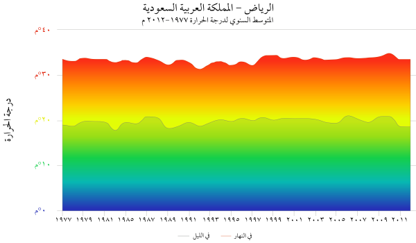 هذا التفسير يريح كثيراً من الدول الملوثة ويتيح لها التهرب من مسؤوليتها أو من ذنبها في ارتفاع درجات الحرارة، ولو تمعنا في الشكل المرفق عن مدينة الرياض لرأينا أن درجات الحرارة شهدت تقلبات خلال 35 عاماً الأخيرة بين مد وجزر، لكن هناك نزعة بسيطة للارتفاع على غير المعهود وبخاصة في الصيف، ولذلك بدأ الحديث يدور بين الناس عن تأخر بداية زراعة بعض المحاصيل وحصادها، كما بدئ باستخدام المكيفات في مناطق لم تعهد ذلك.
