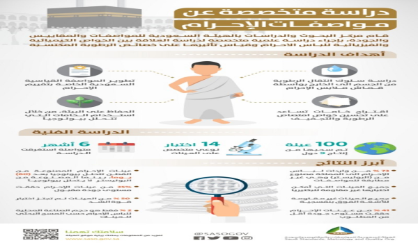 جاء ذلك ضمن دراسة نشرت الهيئة نتائجها وأجراها مركز البحوث والدراسات التابع للهيئة، وكانت تهدف إلى دراسة سلوك انتقال الرطوبة من الجسم إلى الخارج بوساطة قماش ملابس الإحرام، وهدفت أيضاً إلى تطوير المواصفة القياسية السعودية الخاصة بتقييم ملابس الإحرام.