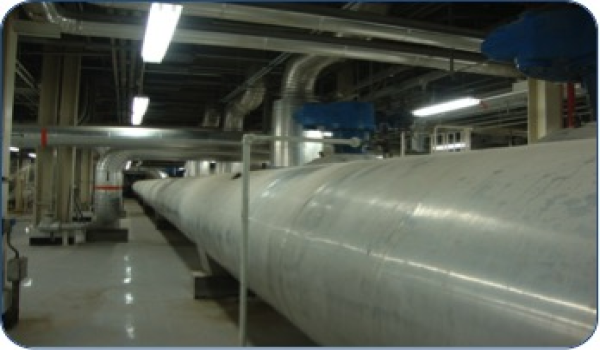 يعتمد نظام المياه المبردة على ثمانية مضخات تقوم بضخ المياه في دورة مغلقة لتدوير المياه المبردة، وتبلغ سعة كل مضخة 472 لترًا في الثانية لتوليد ضغط مياه يعادل 84 مترًا مياه، ويتم طرد الحرارة المتولدة من المبردات في الجو من خلال 7 أبراج تبريد تبخيرية من النوع المفتوح، وتم تصميم كل دورة من دورات أبراج التبريد تلك لتبريد حوالي 665 لتراً في الثانية من الماء من 36.6 درجة مئوية إلى 25.6 درجة مئوية، والتي يتم دفعها إلى داخل المكثف الخاص بالمبردات باستخدام 9 مضخات مياه لتبريد المكثف بالمبردات، تبلغ سعة كل مضخة 665 لترًا في الثانية وبقوة 350 حصانًا.