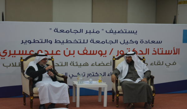 استضاف منبر الجامعة في لقائه الرابع، الاثنين الماضي، وكيل الجامعة للتخطيط والتطوير أ. د. يوسف عبده عسيري في لقاء مفتوح مع أعضاء هيئة التدريس بالجامعة، وأدار الحوار عضو هيئة التدريس بقسم الإعلام د. تركي العيار، وتم خلال اللقاء استعراض الخطط الاستراتيجية لوحدات الجامعة، والمشروعات التي تم تمويلها كوكالة الجامعة لشؤون الطالبات، وكليات العلوم، والآداب، وإدارة الأعمال، وعمادة الدراسات العليا، وعمادة تطوير المهارات، وغيرها من الكليات والعمادات، ومناقشة الدليل العلمي الخاص بالتطوير الإداري والأكاديمي والمالي والذي أرسلته جامعة الملك سعود كأول جامعة لوزارة التعليم.