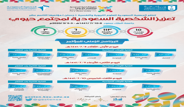 وتأكيدًا لذلك تُنظِّم الجمعية السعودية للعلوم التربوية والنفسية «جستن» الثلاثاء القادم مؤتمرها التاسع عشر بعنوانٍ يشكّل مضمونه أحد البرامج الأساسية في رؤية السعودية 2030، وهو «تعزيز الشخصية السعودية لمجتمع حيوي»، وذلك في الفترة 8 - 10 رجب 1441هـ الموافق 3-5 مارس 2020م، ويستضيف المؤتمر مجموعة من المتحدثين والمتحدثات من أصحاب السمو والمعالي والسعادة ذوي الاختصاصات المرتبطة بشكل مباشر في مجالات المؤتمر الرئيسة.