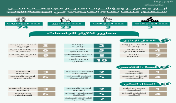 وأضاف أن مجلس شؤون الجامعات اعتمد 23 معياراً و74 مؤشراً لتحديد مدى جاهزية الجامعات لتطبيق نظام الجامعات عليها؛ وفق ثلاثة مجالات تشمل الجوانب الأكاديمية، والإدارية والمالية، كما تم تشكيل لجنة للمراجعة والفحص والتدقيق تضم خبراء من عدد من الجامعات لعملية تحليل الجاهزية، مشيراً إلى أنه تم تشكيل لجنة ضمت عدداً من المتخصصين في القياس والتقويم، وإدارة التعليم الجامعي؛ لتحكيم التقارير الذاتية التي ترد من الجامعات ومراجعتها، وجاء الاختيار للجامعات الثلاث بناءً على أعلى نسبة من المعايير والمؤشرات المعتمدة.
