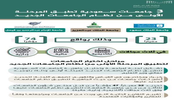 صدرت موافقة المقام السامي الكريم على تسمية ثلاث جامعات لتكون ضمن الجامعات التي يُطبق عليها نظام الجامعات الجديد، وهي جامعة الملك سعود، جامعة الملك عبدالعزيز، وجامعة الإمام عبدالرحمن بن فيصل، بما يحقق رؤية سمو ولي العهد في التمكين والتميّز والجودة والتطوير المستمر.