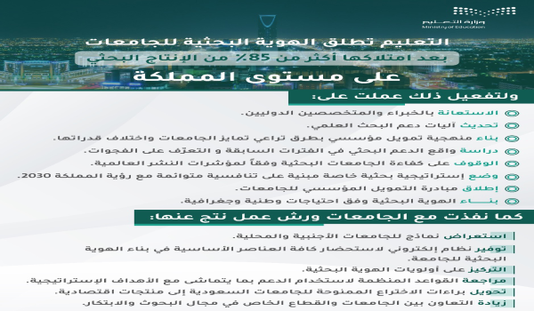 وتظمت الوزارة في إطار ذلك ورشة عمل حول الهوية البحثية، تم خلالها استعراض النماذج والقوالب والأدلة وعرض نماذج للجامعات الأجنبية والمحلية، كما وفرت نظاماً إلكترونياً لاستحضار كافة العناصر الأساسية في بناء الهوية البحثية للجامعة تشمل: الاحتياجات الوطنية، الطبيعة الجغرافية والمناطقية للجامعة، مؤشرات الرؤية، القدرات البحثية المتوفرة بالجامعة، التخصصات، الأساتذة.