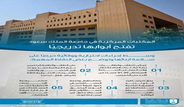 أعلنت المكتبات المركزية في الجامعة عن فتح أبوابها بشكل تدريجي لاستقبال المستفيدين خلال وقت العمل من الساعة من الساعة 8:00 ص إلى الساعة ١:٣٠ م، من الأحد إلى الخميس، دون الفترة المسائية، وسط إجراءات احترازية ووقائية حرصاً على سلامة الطلاب والطالبات.