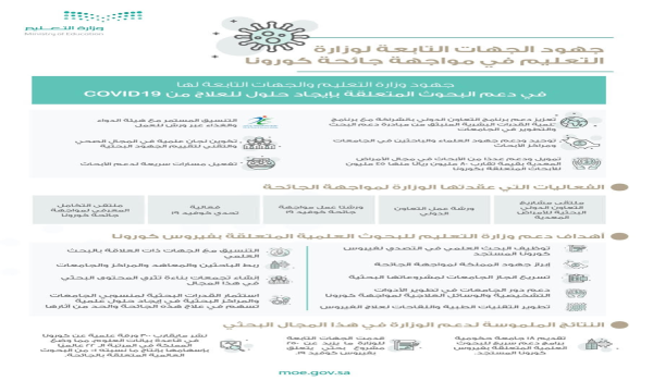 وكانت وزارة التعليم، قد نظمت عدداً من الفعاليات المتخصصة بمشاركة عدد كبير من الجامعات ومراكز الأبحاث السعودية والباحثين والأكاديميين؛ للتصدي لـ «COVID 19» ومناقشة سبل الوقاية والعلاج من الفيروس، حيث موّلت وكالة الوزارة للبحث والابتكار ودعمت عدداً من الأبحاث في مجال الأمراض المعدية بقيمة تقارب 80 مليون ريال، تم تخصيص 45 مليوناً منها للأبحاث المتعلقة بكورونا في ملتقى مشاريع التعاون الدولي البحثية للأمراض المعدية، الذي أُقيم في الرياض مؤخراً، بجانب عقد ورشة عمل التعاون الدولي، وورشتي عمل مواجهة جائحة «كوفيد 19» وفعالية تحدي «كوفيد 19» إضافة إلى ملتقى التكامل المعرفي لمواجهة جائحة كورونا.