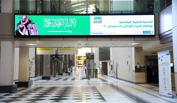 نظمت المدينة الطبية بجامعة الملك سعود فعاليات اليوم الوطني 90 مع تطبيق الاحترازات الوقائية من فايروس كورونا، حيث تم توزيع هدايا عينية تحمل شعار اليوم الوطني لمنسوبي المدينة الطبية الجامعية وزوارها، كما تم بث مواد حول اليوم الوطني من خلال الشاشات الداخلية، وتزينت المباني الخارجية لمستشفى الملك خالد ومستشفى الملك عبدالعزيز ومستشفى طب الأسنان الجامعي بالإضاءة الخضراء بالإضافة إلى بوسترات ومجسمات ثلاثية الأبعاد تحمل علم المملكة وشعارات الوطن، كما نظم مركز التبرع بالدم في المدينة الطبية بهذه المناسبة حملة للتبرع بالدم شارك فيها منسوبو وزوار المدينة الطبية.