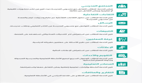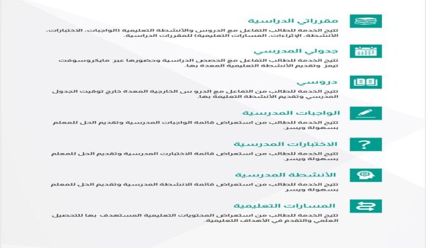 ويوفر تطبيق مدرستي مجموعة من الخدمات الأخرى للبقاء على التواصل والاطلاع، والتحديث المستمر بواسطة التنبيهات، والتحديثات المتاحة، وإمكانية طرح الأسئلة على معلمي المقررات الدراسية، والوصول السريع إلى جميع الأنشطة التعليمية والمدرسية المجدولة.