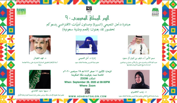 نظم صالون أدبيات الافتراضي بالتعاون مع مبادرة «السيرة» للدكتوة أمل التميمي الأستاذ المشارك بقسم اللغة العربية بجامعة الملك سعود، وبالتزامن مع يوم الوطن الـ 90، أمسية وطنية افتراضية بعنوان «قمم وطنية سعودية» عبر منصة زووم، وذلك يوم الاثنين 11 صفر 1442هـ، بمشاركة د. فارس المشرافي الأستاذ بقسم التاريخ، د. فهد الطياش أستاذ الإعلام التطبيقي ورئيس تحرير صحيفة رسالة الجامعة سابقاً، د. زينب الخضيري عضو هيئة تدريس بالجامعة ورئيسة مبادرة التفرغ الثقافي، أ. سمها الغامدي رئيسة مجلس إدارة جمعية كيان لرعاية الأيتام.