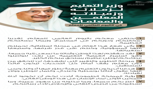 وقال وزير التعليم إن شعار هذا العام «المعلمون: القيادة في أوقات الأزمات ووضع تصور جديد للمستقبل»؛ يأتي في مرحلةٍ استثنائية، تحمّل فيها المعلمون والمعلمات المسؤولية، وكانوا على قدر شرفها، واستيعاباً لمتغيراتها، وعزماً في مواجهة تحدياتها، فتحقق لهذا الوطن وأبنائه ما نسعى إليه جميعاً، وهو استمرار العملية التعليمية عن بُعد؛ لتواصلوا عطاءكم لوطن عظيم يستحق منكم الكثير.