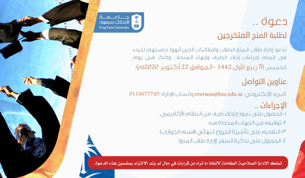 دعت إدارة المنح الطلاب والطالبات الذين أنهوا دراستهم للبدء في إتمام إجراءات إخلاء الطرف وإنهاء المنحة، وذلك قبل يوم الخميس 5 ربيع الأول 1442هـ الموافق 22  أكتوبر 2020م.